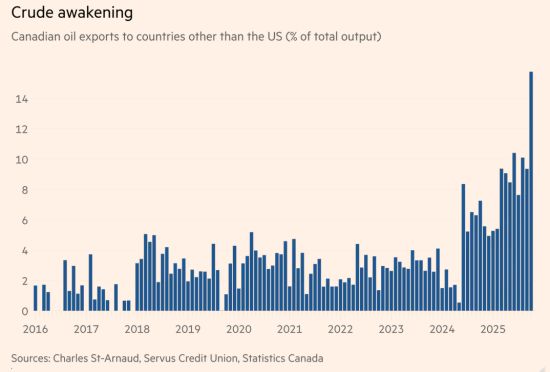 Par le passé, le pétrole bitumineux de l'Alberta était vendu aux USA à un prix réduit. Avec une menace de taxes à 100% par l'ami Trump, Ottawa cherche à exporter son pétrole en Chine et au Japon. Ainsi, les ventes vers Pékin ont quadruplé à 88,7 millions de barils en 2025. L'augmentation a débuté avec le pipeline Trans Mountain qui relie l'Alberta aux ports de la côte Ouest.