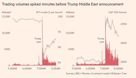 De plus en plus de décisions de Trump sont utilisées par des traders très bien informés. On appelle cela du délit d'initiés. 15 minutes avant d'annoncer qu'il n'allait pas attaquer les infrastructures pétrolières de l'Iran, des achats de "futurs" pour un montant de $580 millions ont été effectués. Depuis son arrivée à la Maison Blanche, la famille Trump s'est enrichie de $1,4 milliard.