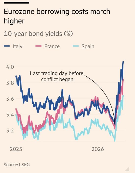 Les taux d'emprunt des pays des obligations d'Etats grimpent au plus haut depuis 2008. L'Italie à 4,14% (+0,8% depuis le début de la guerre), la France 3,9%, l'Espagne 3,7% et 4,43 pour le 10 ans américains. L'inflation regarde à plus de 4% aux USA, contre 2,7 en février.