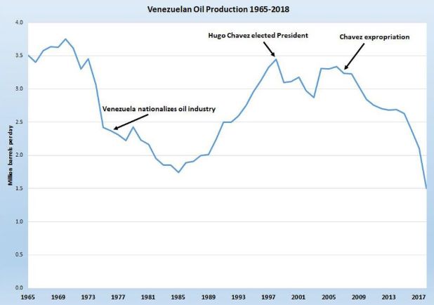 Le pic pétrolier est atteint en 1972 avec plus de 3,7 millions de barils par jour (b/j) de pétrole brut. Encore en 2008, le pays en était à 3,2 millions b/j. Par manque d'entrées financières, le président Chavez nationalisa des entreprises pétrolières étrangères dont des entreprises américaines.