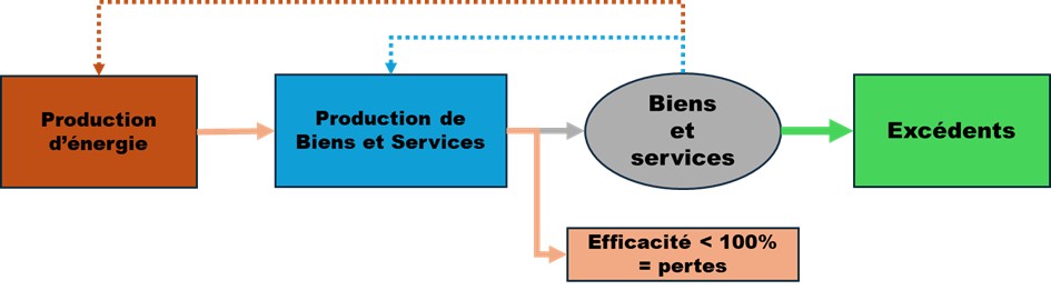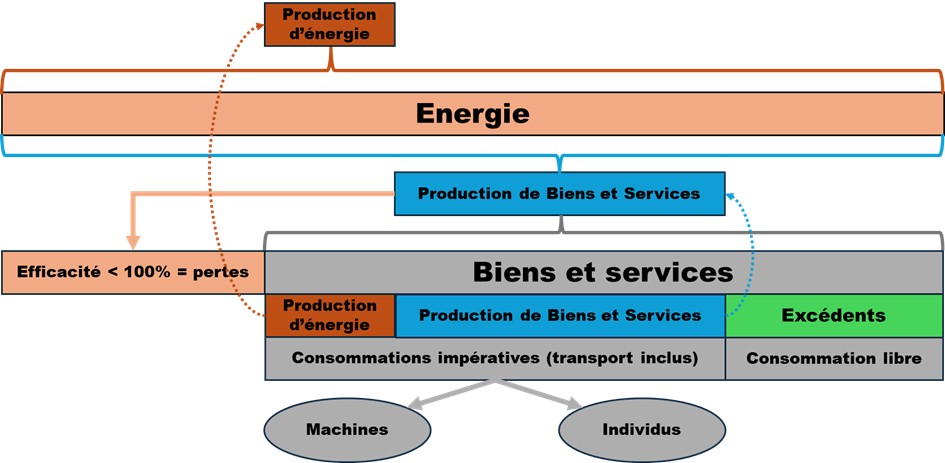• Une production d’énergie : des individus consomment également des biens et services pour extraire, transformer et transporter toute l’énergie utilisée par le système.