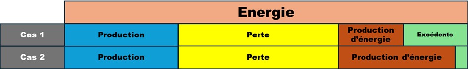 Le tableau ci-dessous illustre la répartition des excédents selon trois prix de l’énergie : minimal, maximal et un prix équilibré (50% des excédents au producteur d’énergie et 50% au producteur de biens et services).
