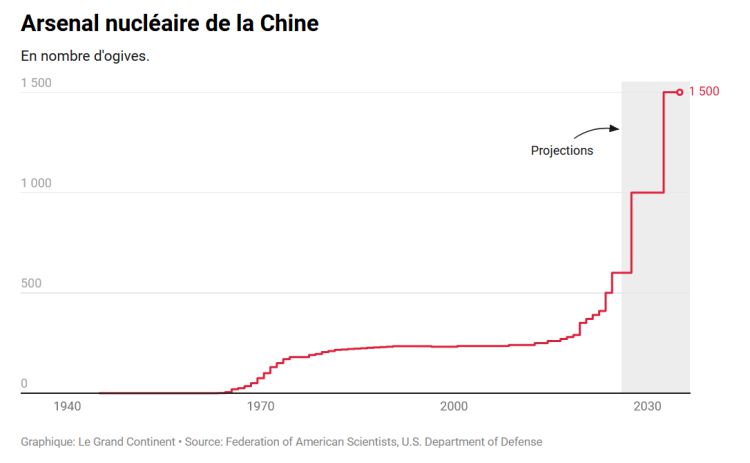 Les Américains pensent que Pékin arrivera à plus de 1’000 ogives nucléaires opérationnelles d’ici 2030 et 1’500 en 2035.