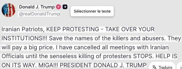 Le gouvernement iranien a utilisé le sang pour combattre une nouvelle révolte du peuple. Le nombre de morts pourrait dépasser les 30'000 en deux jours seulement selon le Sunday Times. Dans un premier temps, Trump avait encouragé les manifestants en promettant qu'une aide allait arriver "on its way", et pschitt. Même pschitt du côté Européen.